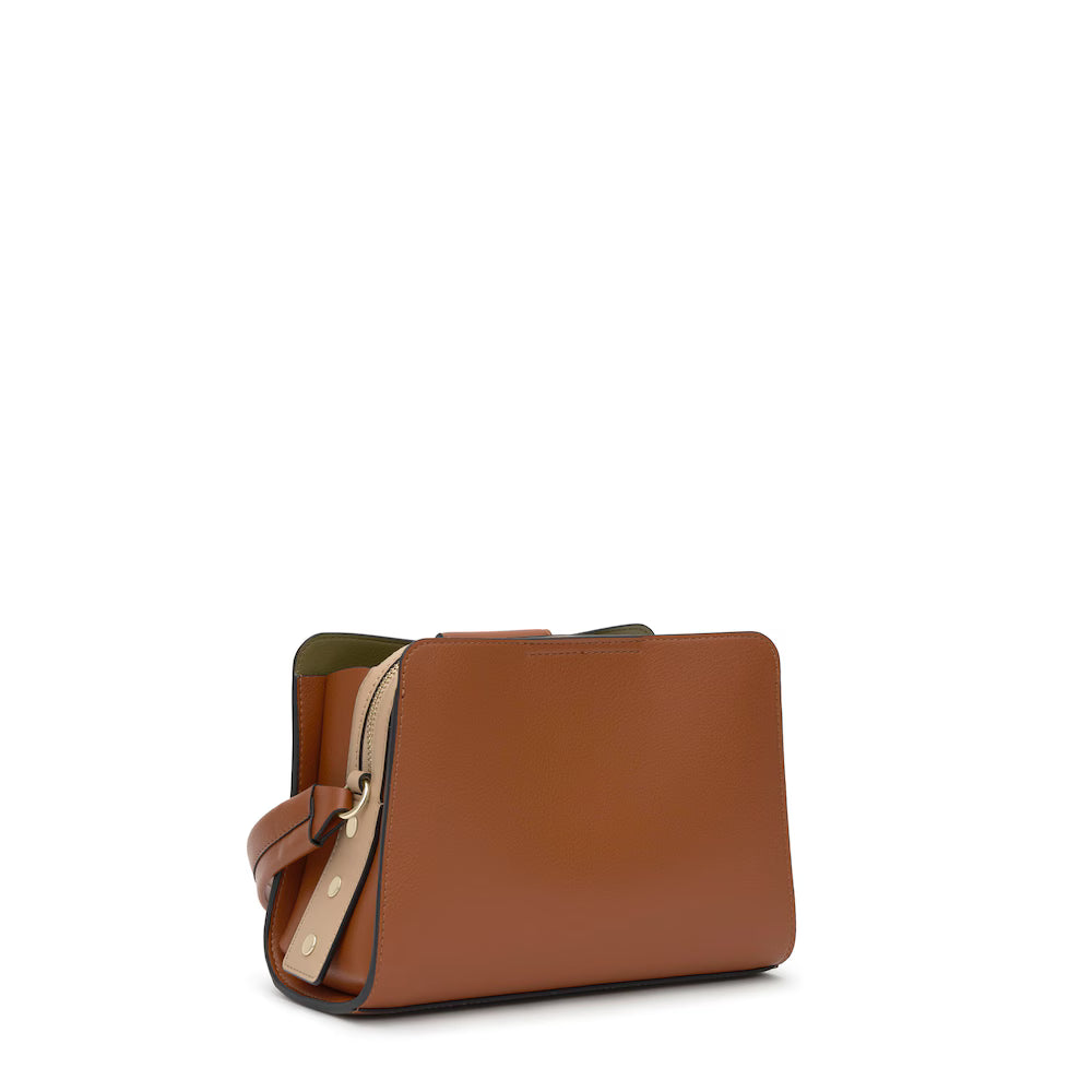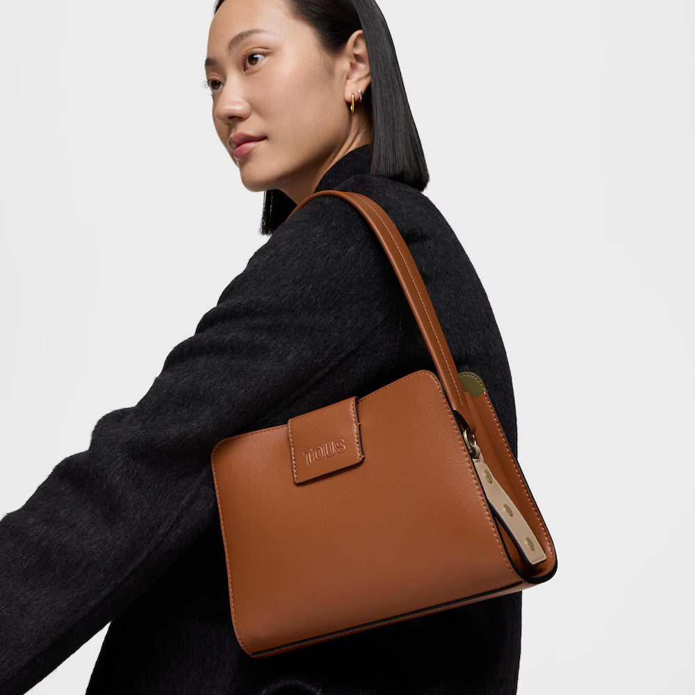 Mala city pequena TOUS Kaos Icon em poliuretano na cor camel. Fecho com botão magnético. Bolso interior com fecho de correr. Alça fixa de ombro. Medidas (altura x largura x profundidade): 11 x 23 x 16 cm.