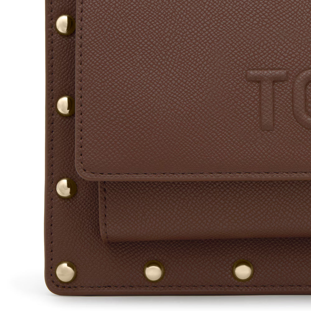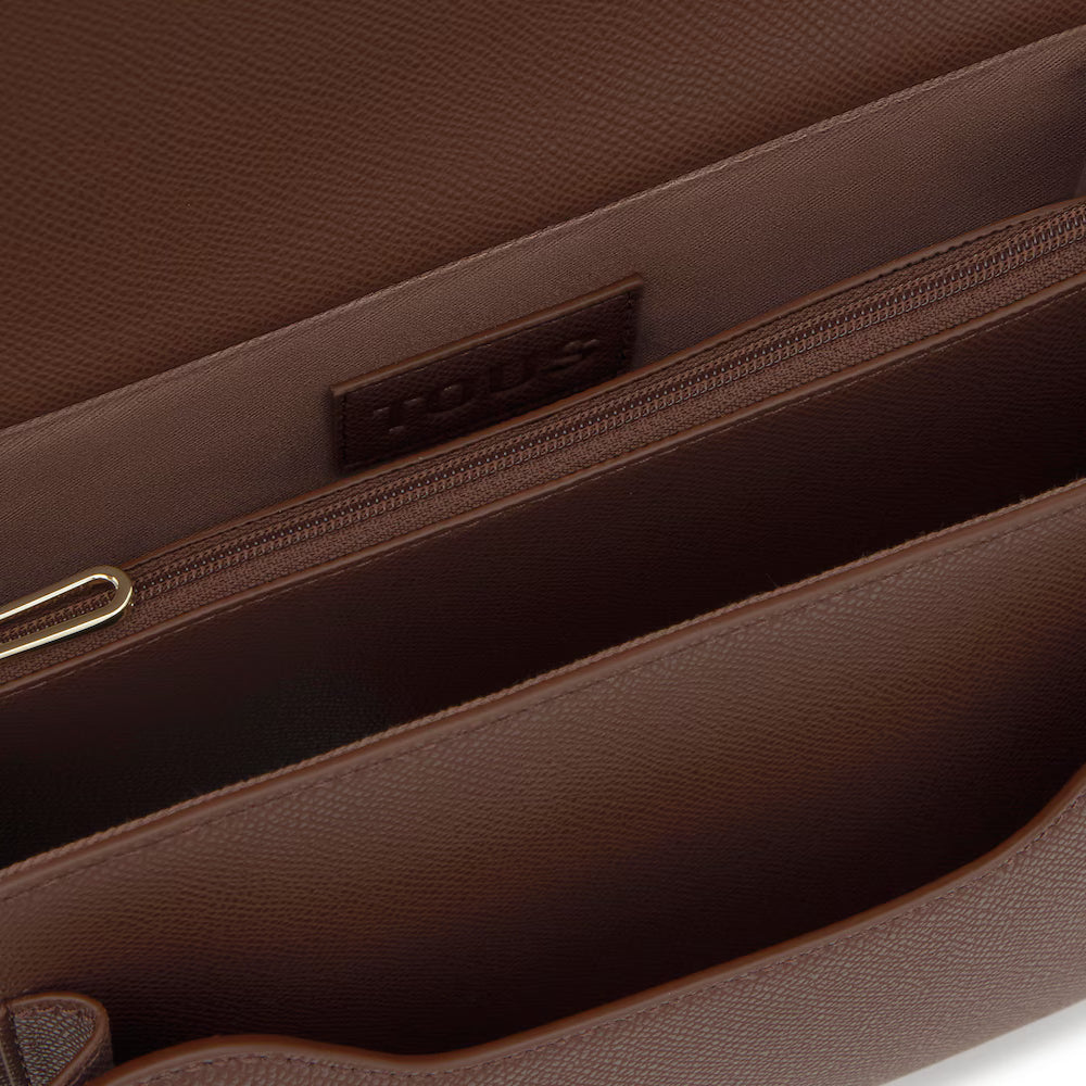 Mala de tiracolo média em poliuretano na cor castanha TOUS Audree Studs. Incorpora uma aba e fecho com dois botões magnéticos. Tem duas divisórias separadas por outra divisória com fecho de correr e um bolso aberto à frente. Alça de ombro fixa e alça de tiracolo ajustável e removível. Medidas (altura x largura x profundidade): 19 x 25 x 11,5 cm.